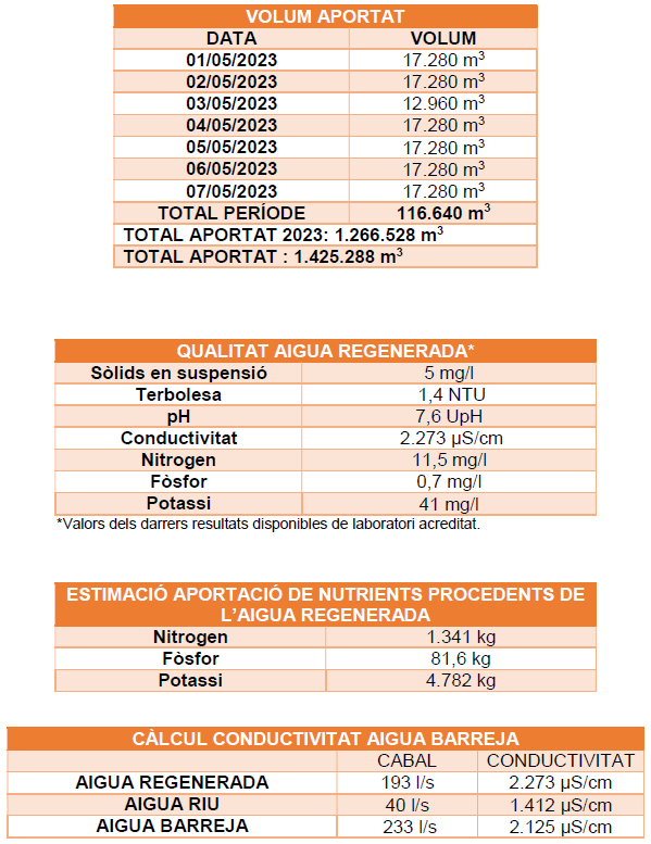 El cabal subministrat durant la setmana del 22 al 28 de maig ha estat de 198 l/s. En aquest període hi ha hagut una incidència els dies 23 i 24 de maig per revisions a les instal·lacions elèctriques durant 1 hora cada dia.